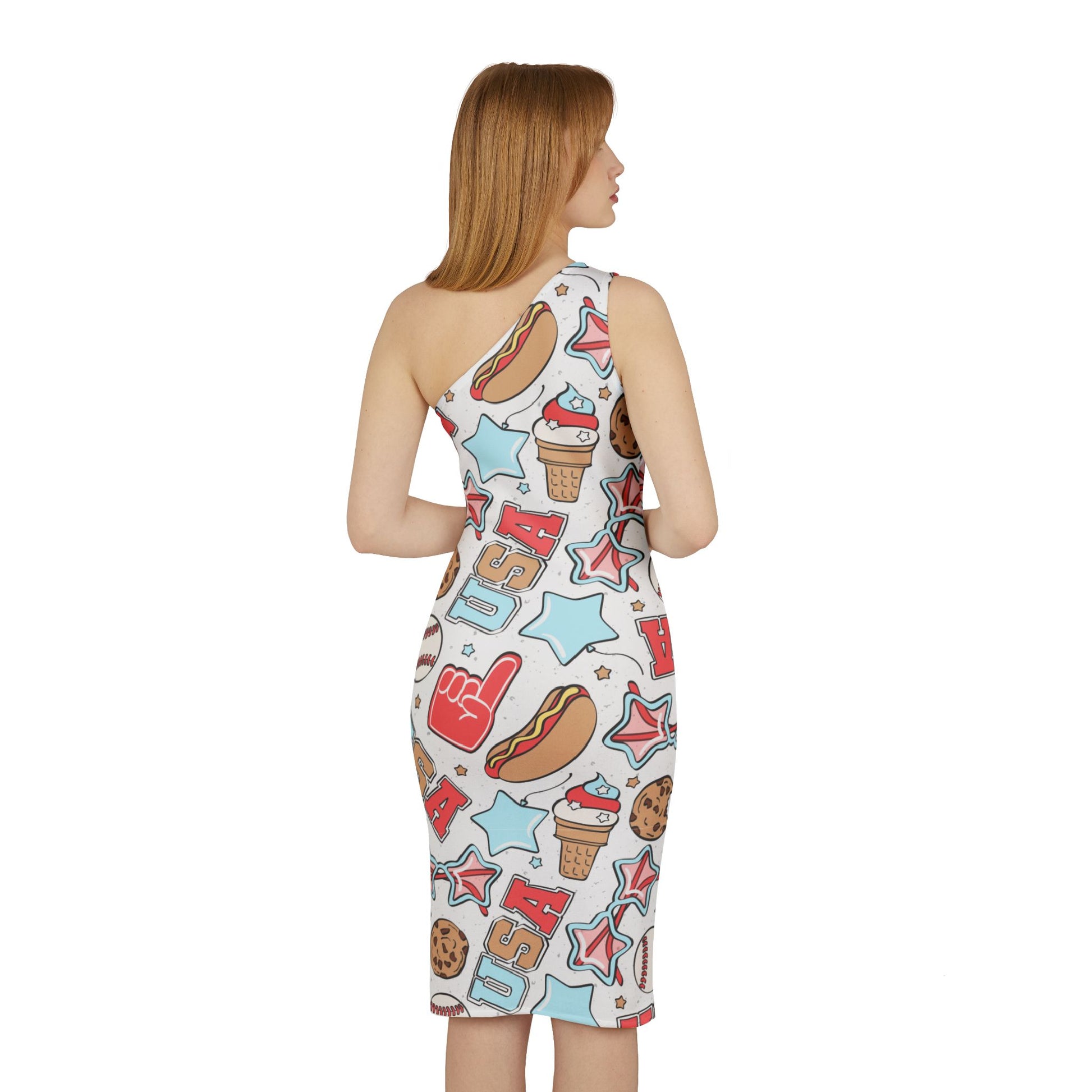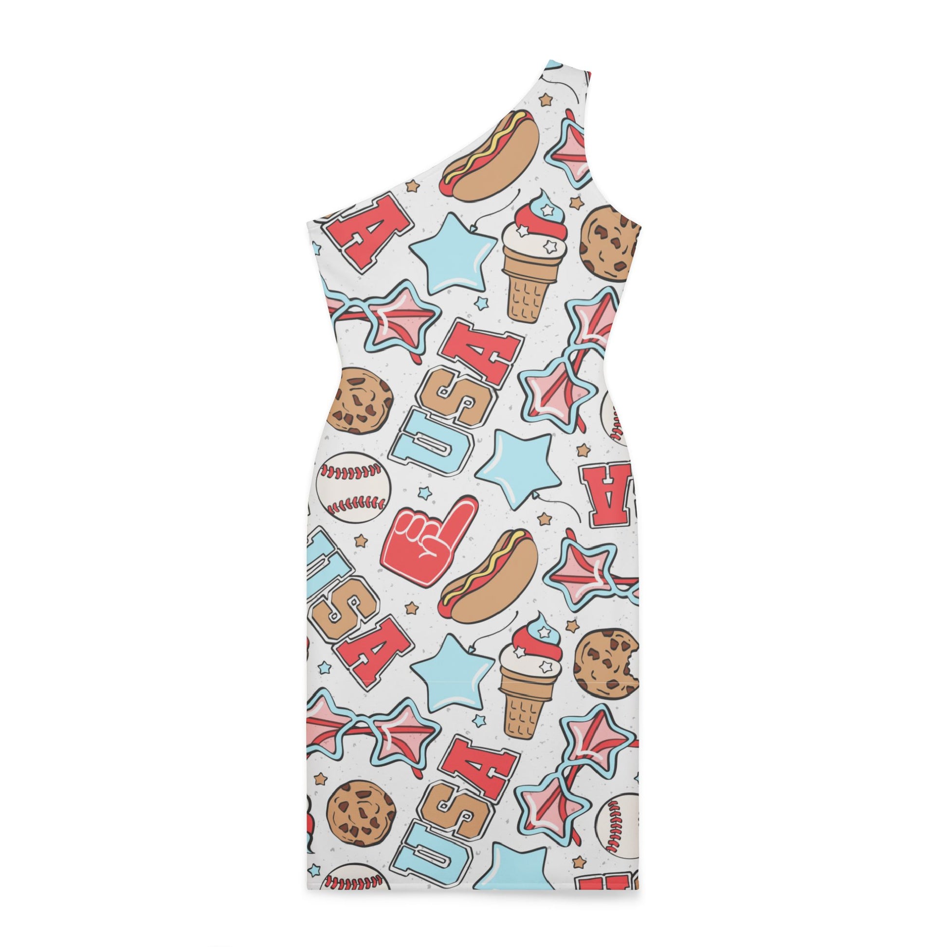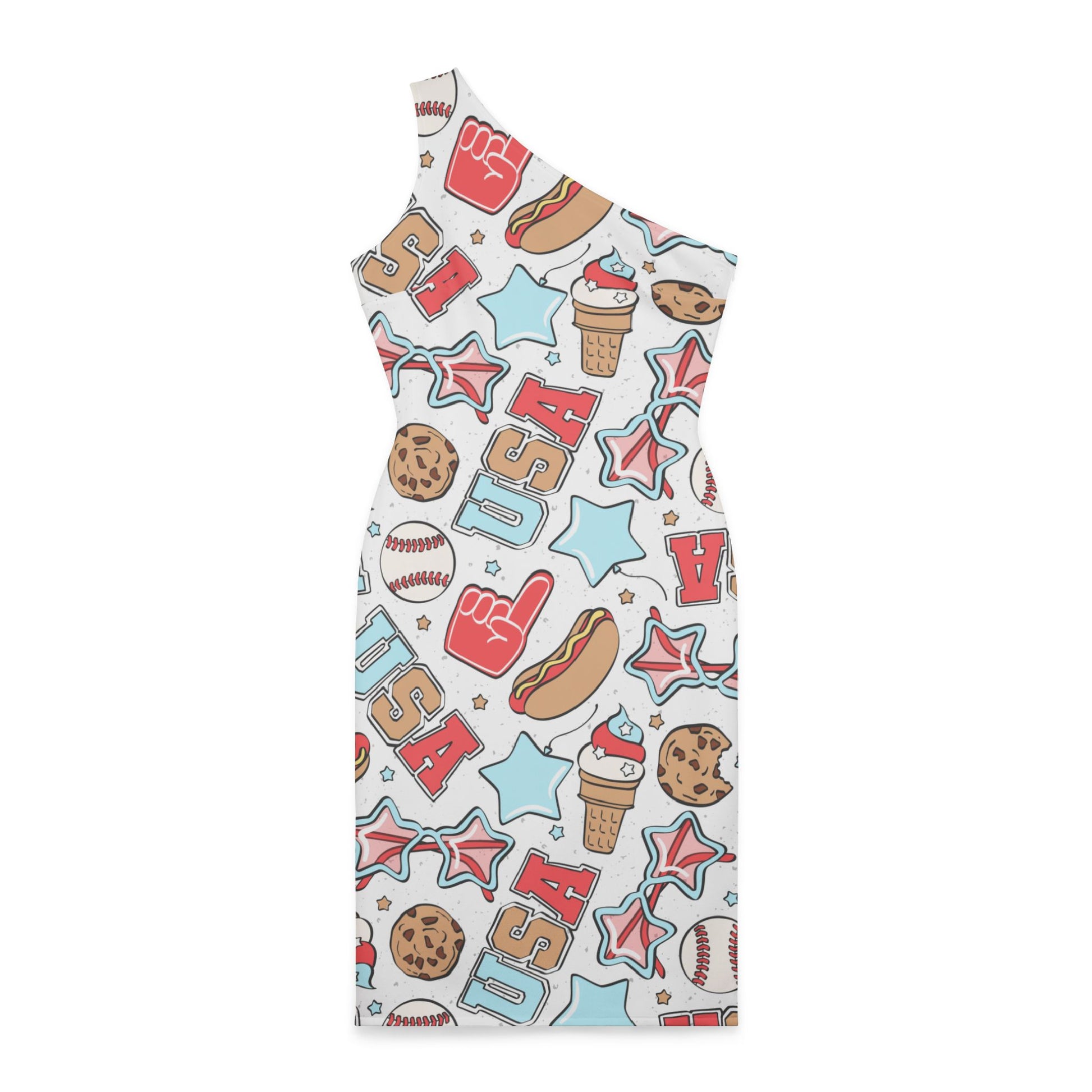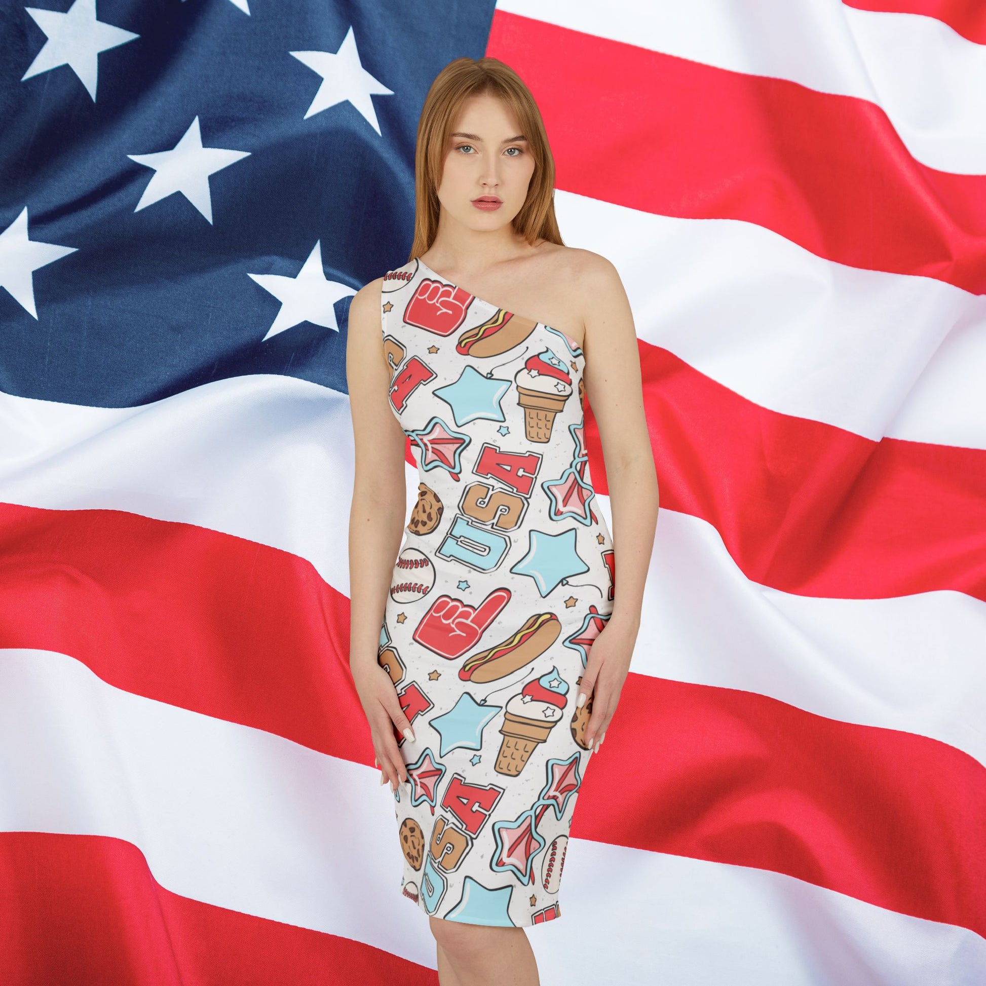 Introducing our USA Design Shoulder Dress - a perfect blend of sophistication and patriotic flair. This one-shoulder dress showcases a fitted silhouette that hugs your curves beautifully, paired with a knee-length straight hem that adds a touch of elegance. Designed with versatility in mind, its sleeveless cut and true-to-size fit make it ideal for any event, whether you're dressing up for a formal occasion or going for a chic, casual look.