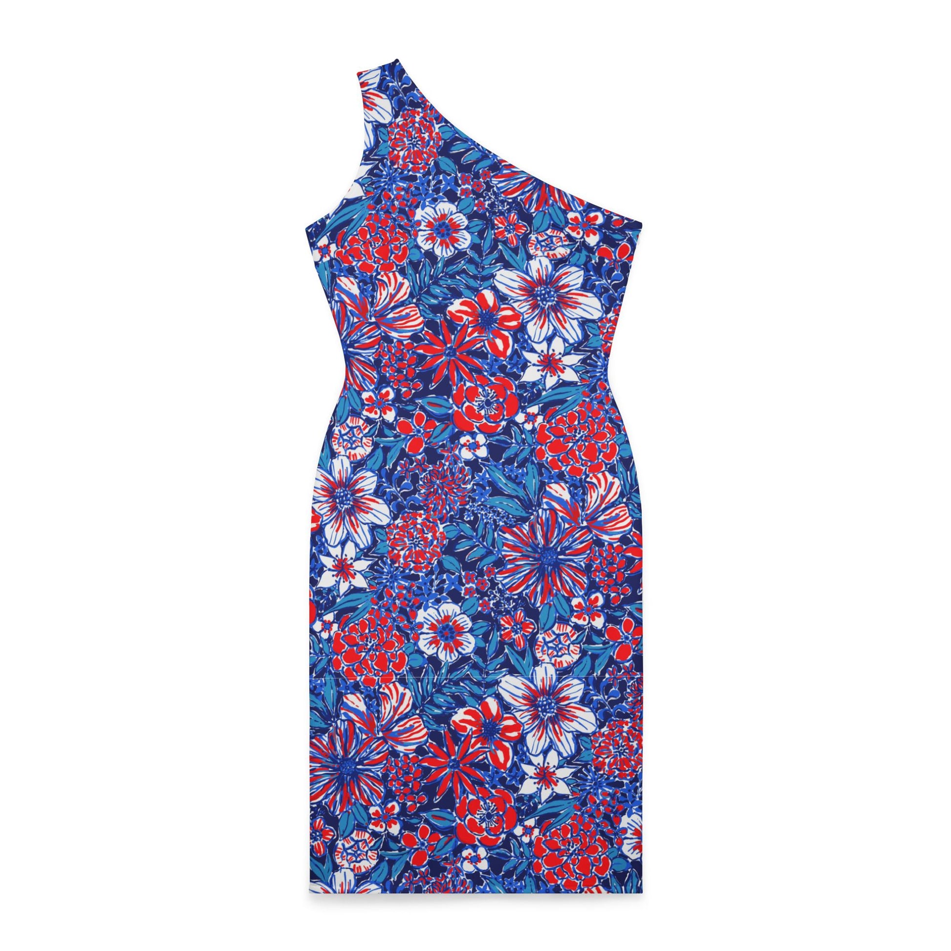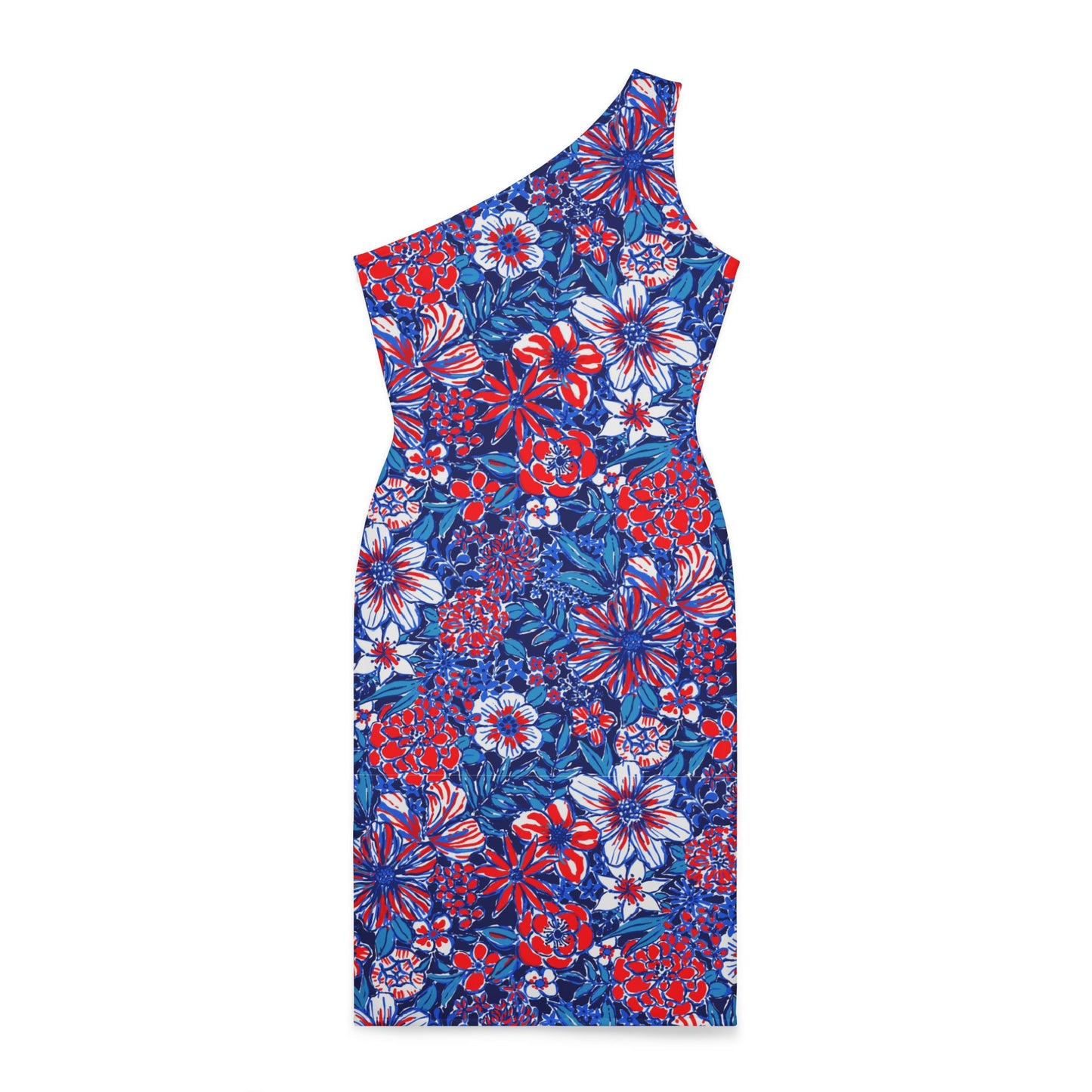 Introducing our USA Design Shoulder Dress - a perfect blend of sophistication and patriotic flair. This one-shoulder dress showcases a fitted silhouette that hugs your curves beautifully, paired with a knee-length straight hem that adds a touch of elegance. Designed with versatility in mind, its sleeveless cut and true-to-size fit make it ideal for any event, whether you're dressing up for a formal occasion or going for a chic, casual look.