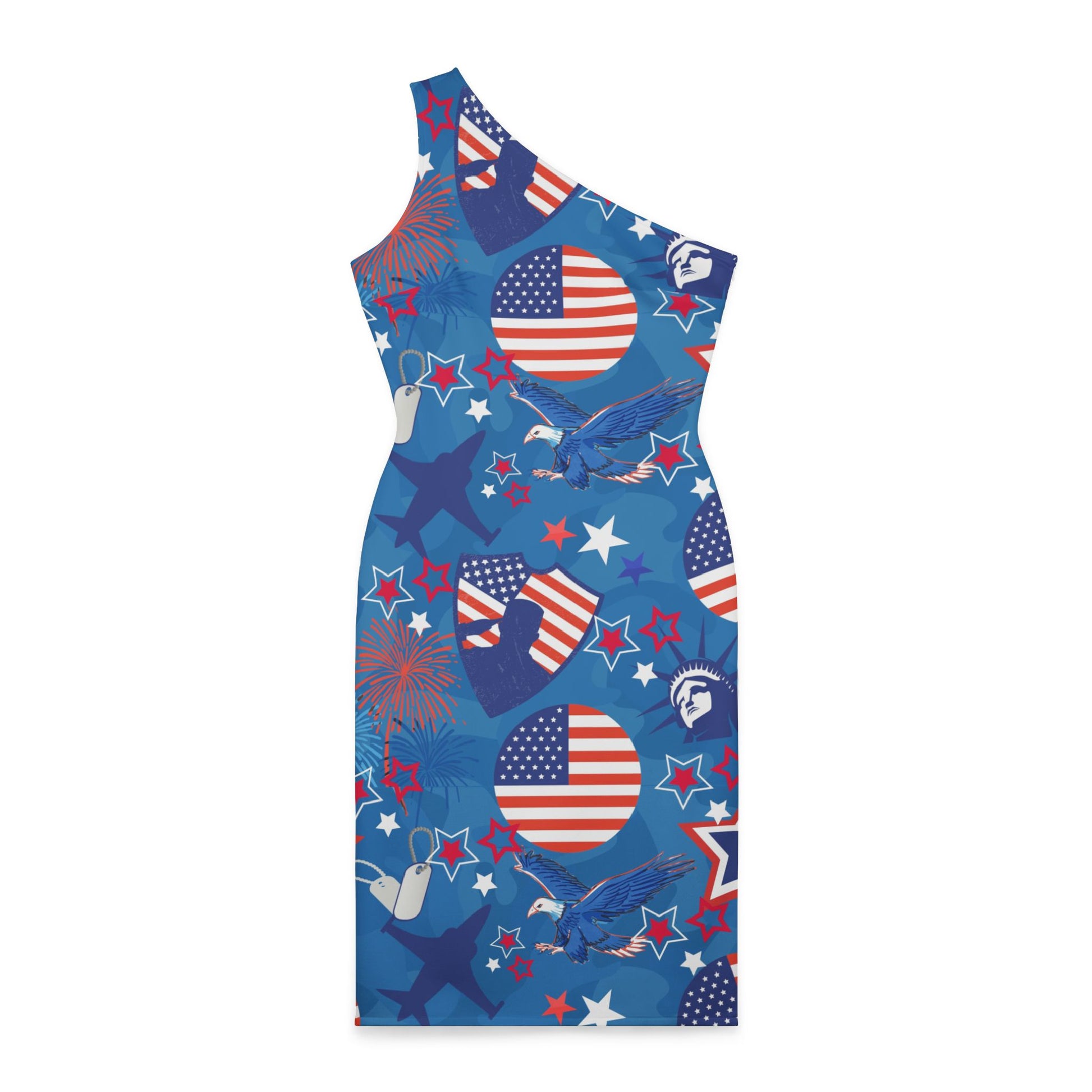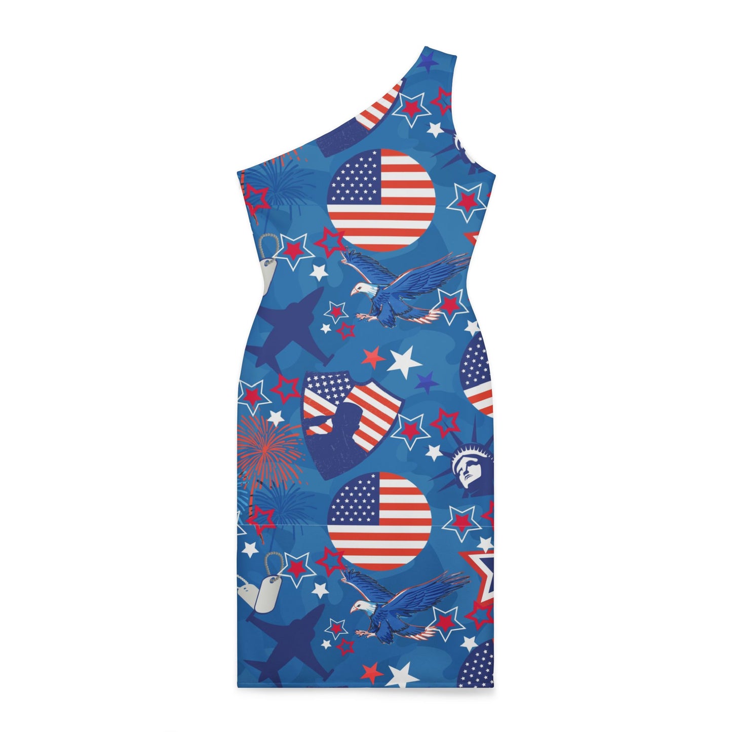 Introducing our USA Design Shoulder Dress - a perfect blend of sophistication and patriotic flair. This one-shoulder dress showcases a fitted silhouette that hugs your curves beautifully, paired with a knee-length straight hem that adds a touch of elegance. Designed with versatility in mind, its sleeveless cut and true-to-size fit make it ideal for any event, whether you're dressing up for a formal occasion or going for a chic, casual look.