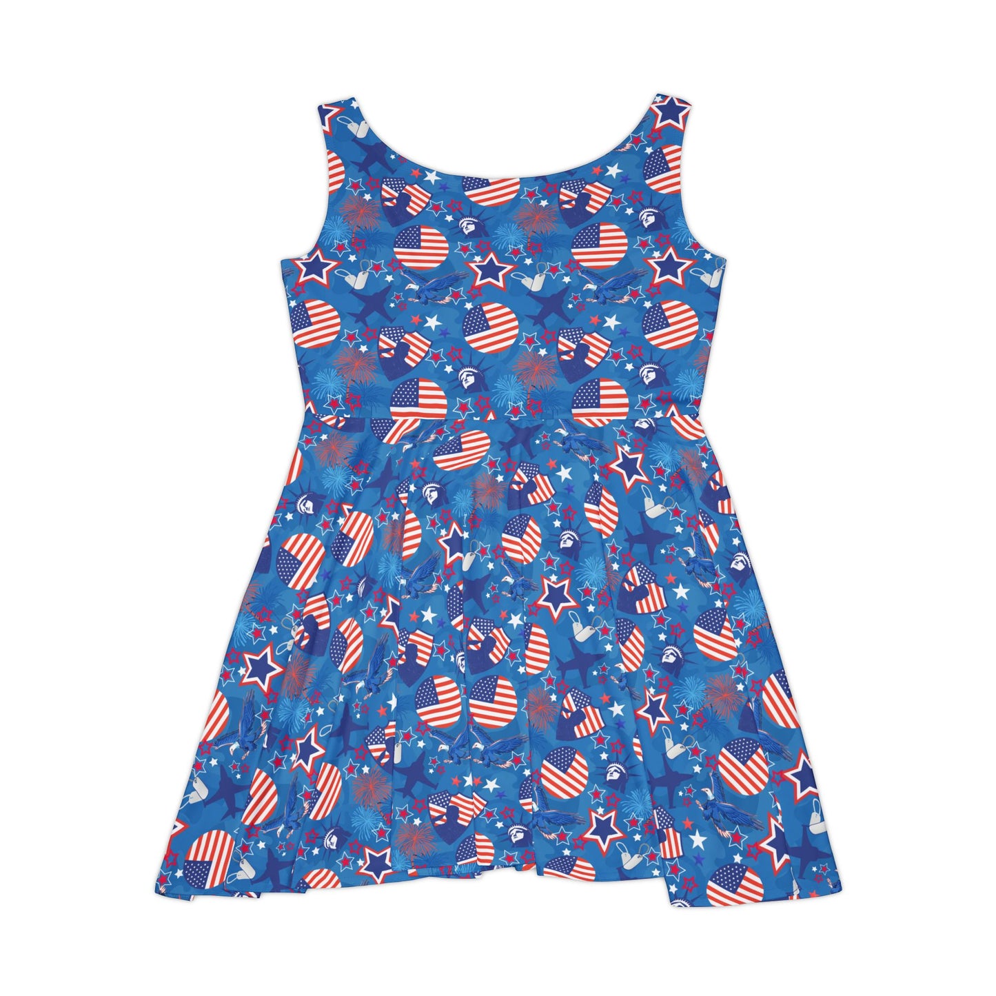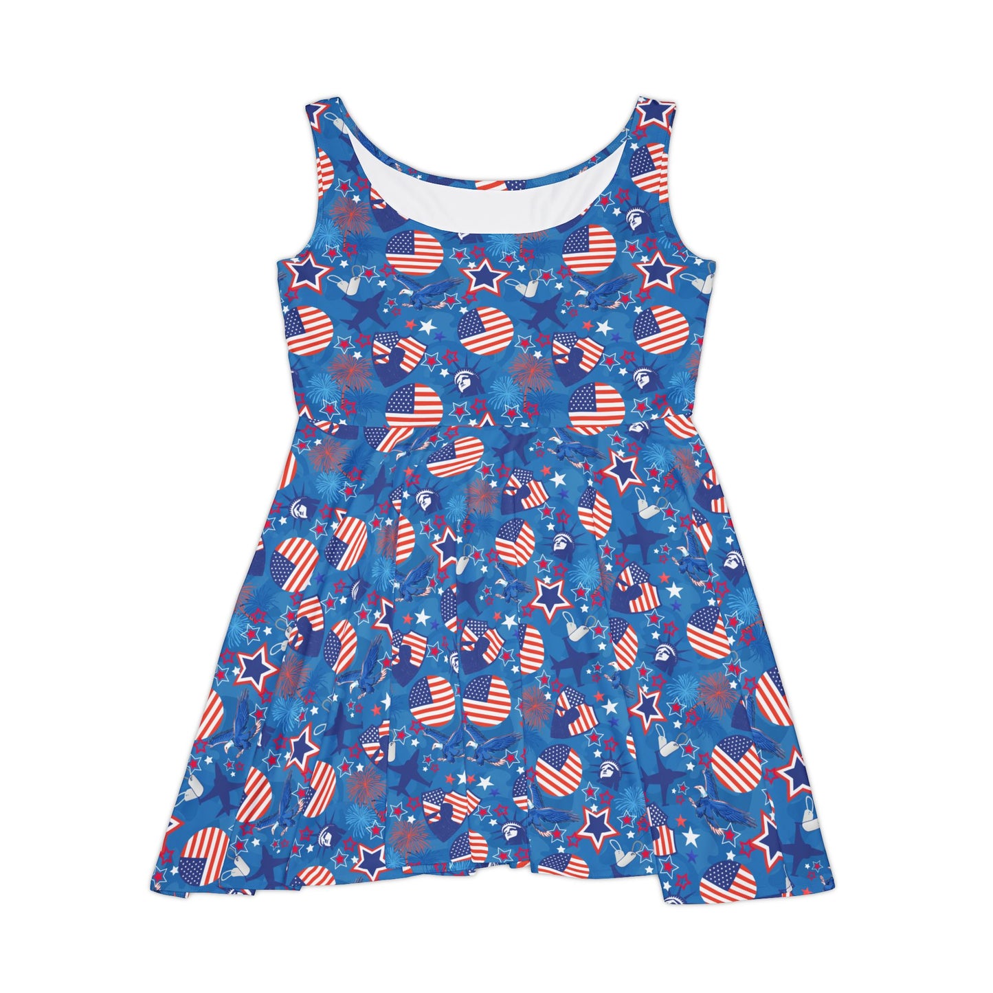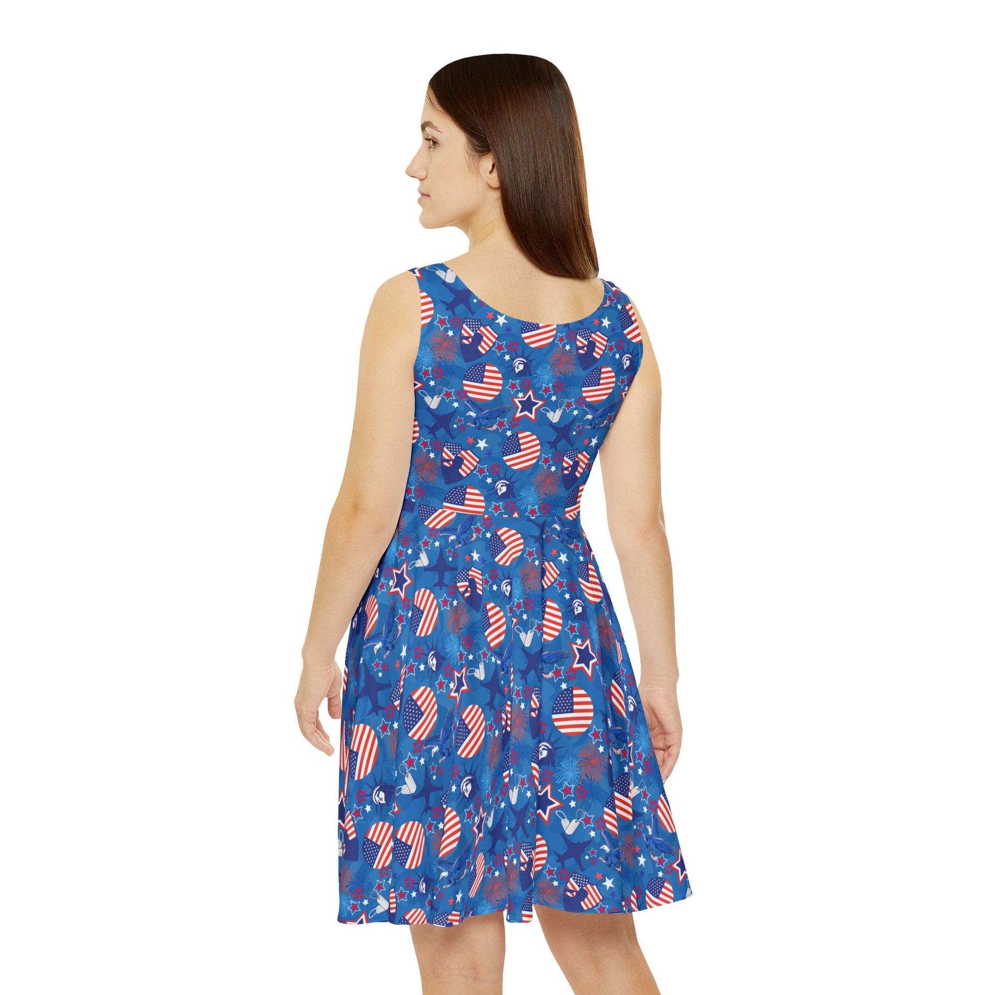 Bring a bold, patriotic vibe to your wardrobe with this USA-inspired skater dress. Whether you're hitting the town or lounging in style, this skater dress combines comfort and flair. Crafted from a high-quality 290gsm fabric blend of 83% polyester and 17% spandex, it's both stretchy and soft, making it perfect for any occasion. Featuring vibrant USA flag motifs in an all-over print, this mid-length dress is a standout piece for celebrations like the 4th of July or Labor Day, or simply for expressing your love for the red, white, and blue all summer long.