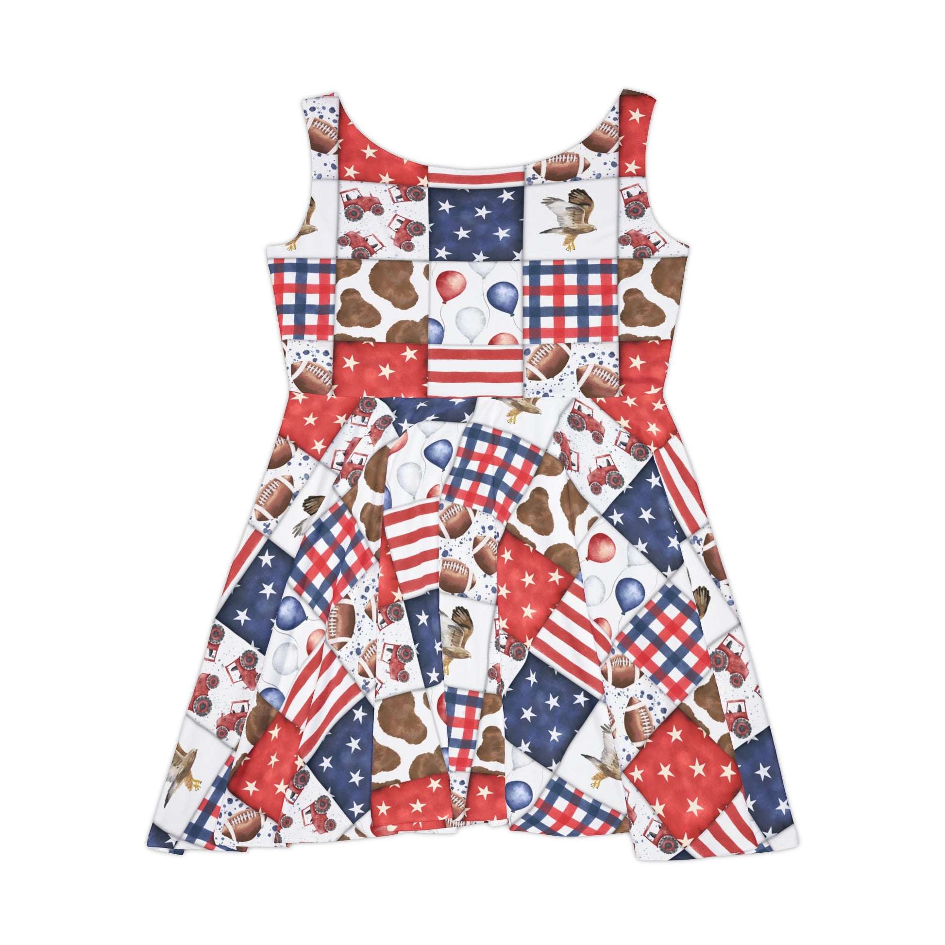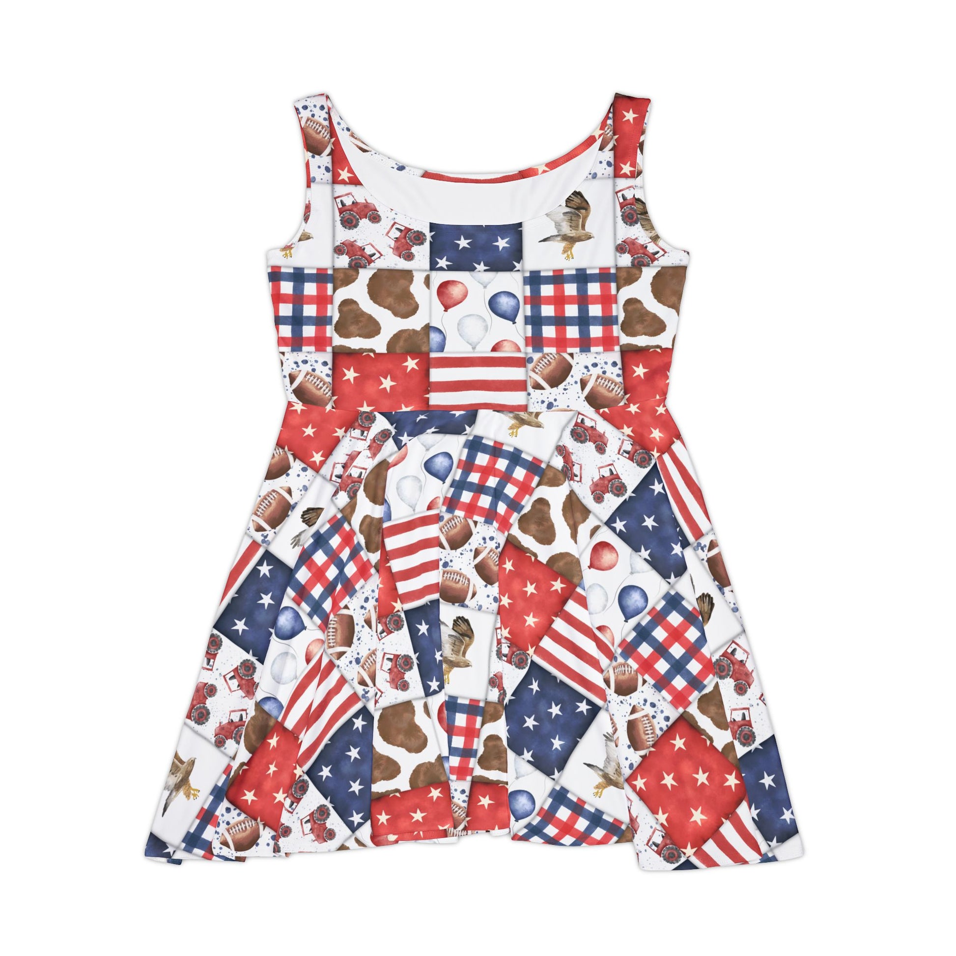 Bring a bold, patriotic vibe to your wardrobe with this USA-inspired skater dress. Whether you're hitting the town or lounging in style, this skater dress combines comfort and flair. Crafted from a high-quality 290gsm fabric blend of 83% polyester and 17% spandex, it's both stretchy and soft, making it perfect for any occasion. Featuring vibrant USA flag motifs in an all-over print, this mid-length dress is a standout piece for celebrations like the 4th of July or Labor Day, or simply for expressing your love for the red, white, and blue all summer long.