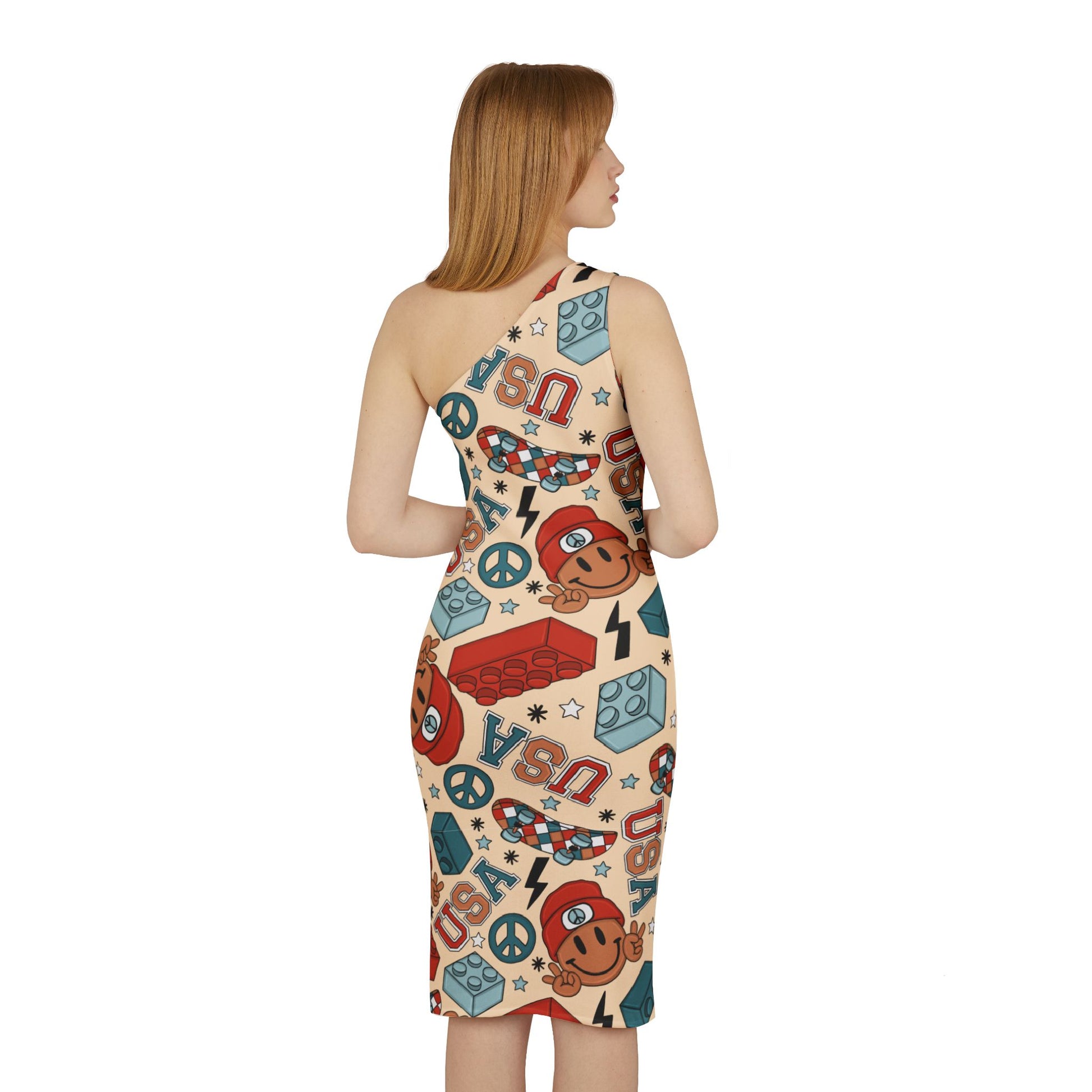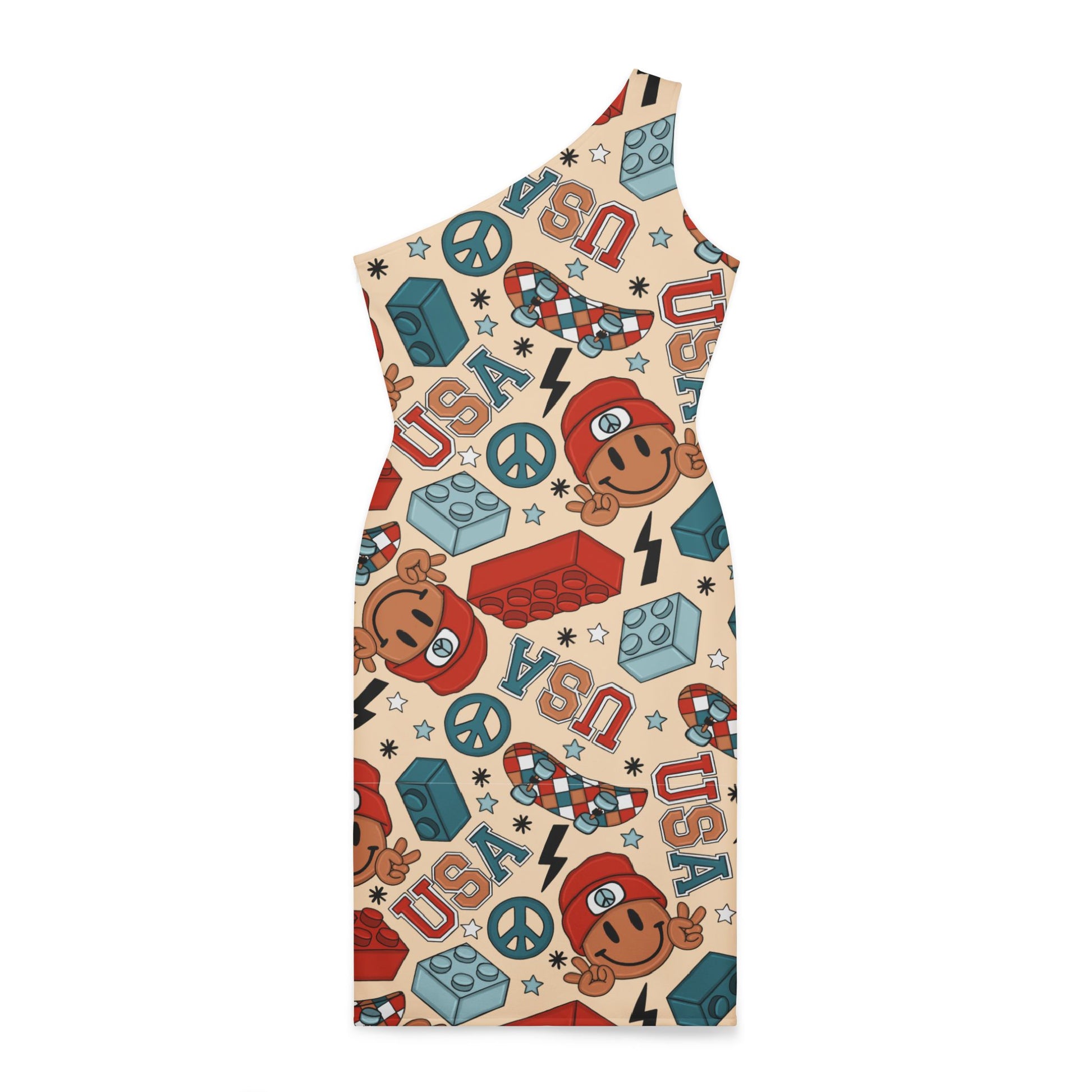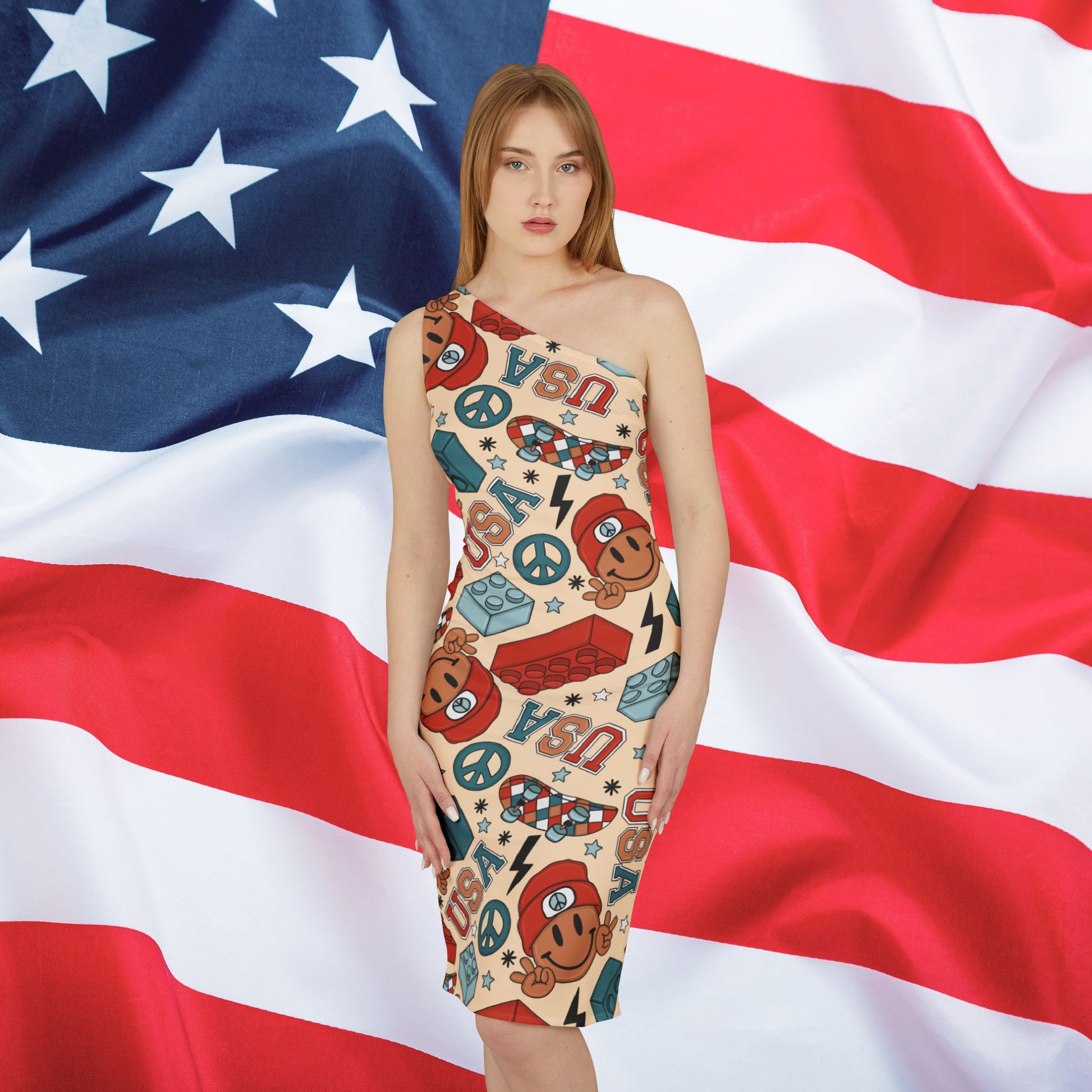 Introducing our USA Design Shoulder Dress - a perfect blend of sophistication and patriotic flair. This one-shoulder dress showcases a fitted silhouette that hugs your curves beautifully, paired with a knee-length straight hem that adds a touch of elegance. Designed with versatility in mind, its sleeveless cut and true-to-size fit make it ideal for any event, whether you're dressing up for a formal occasion or going for a chic, casual look.