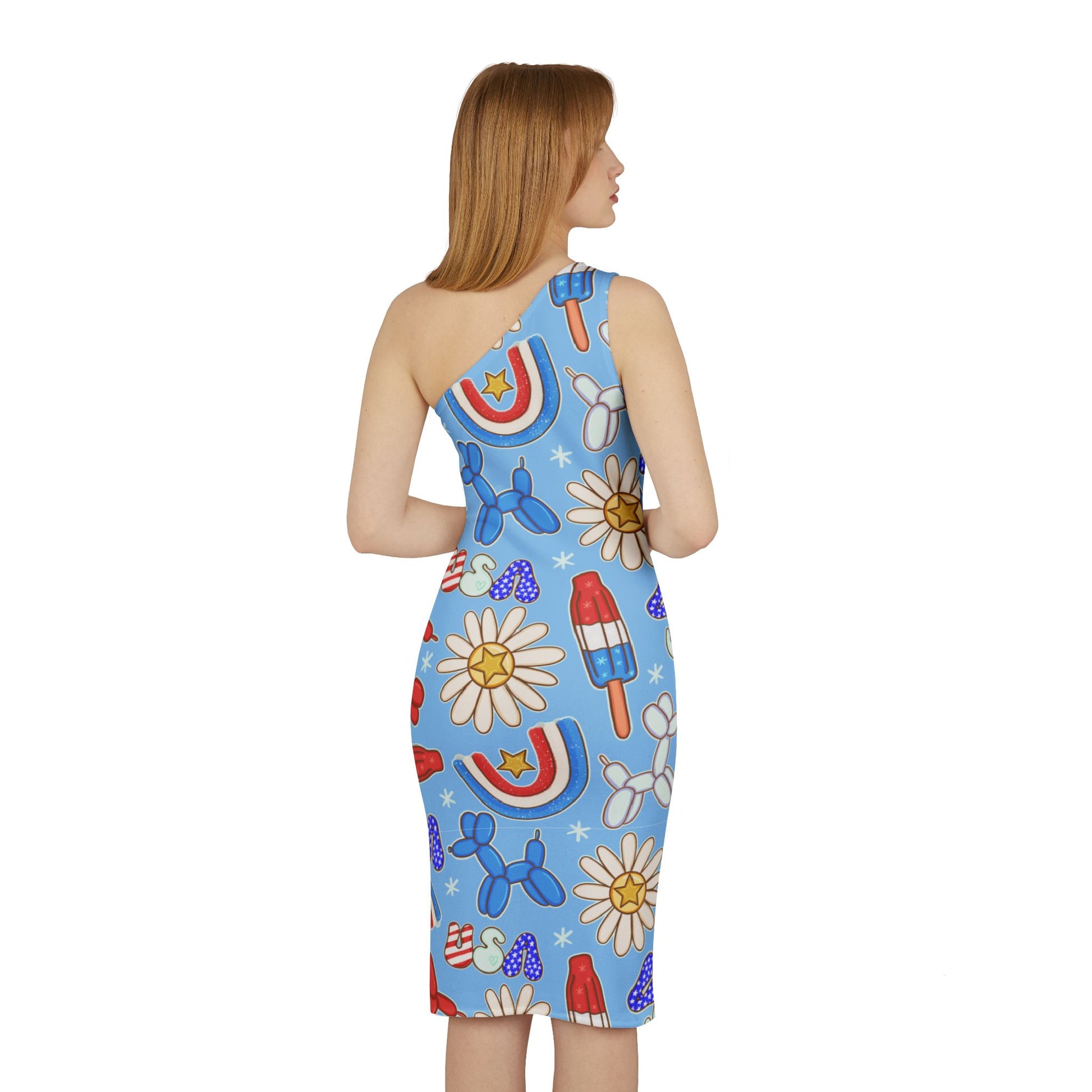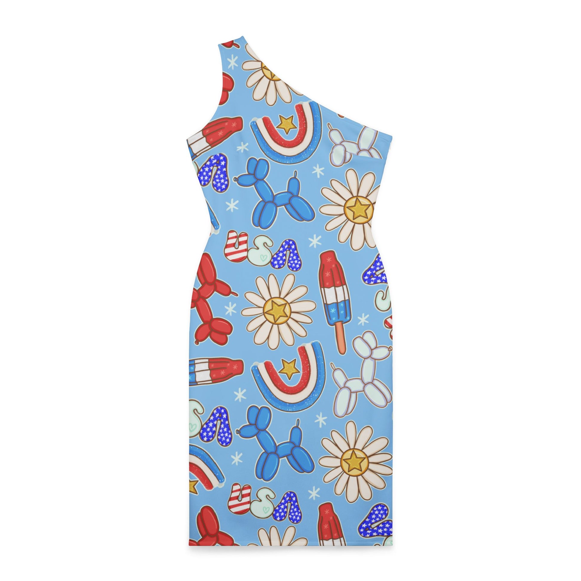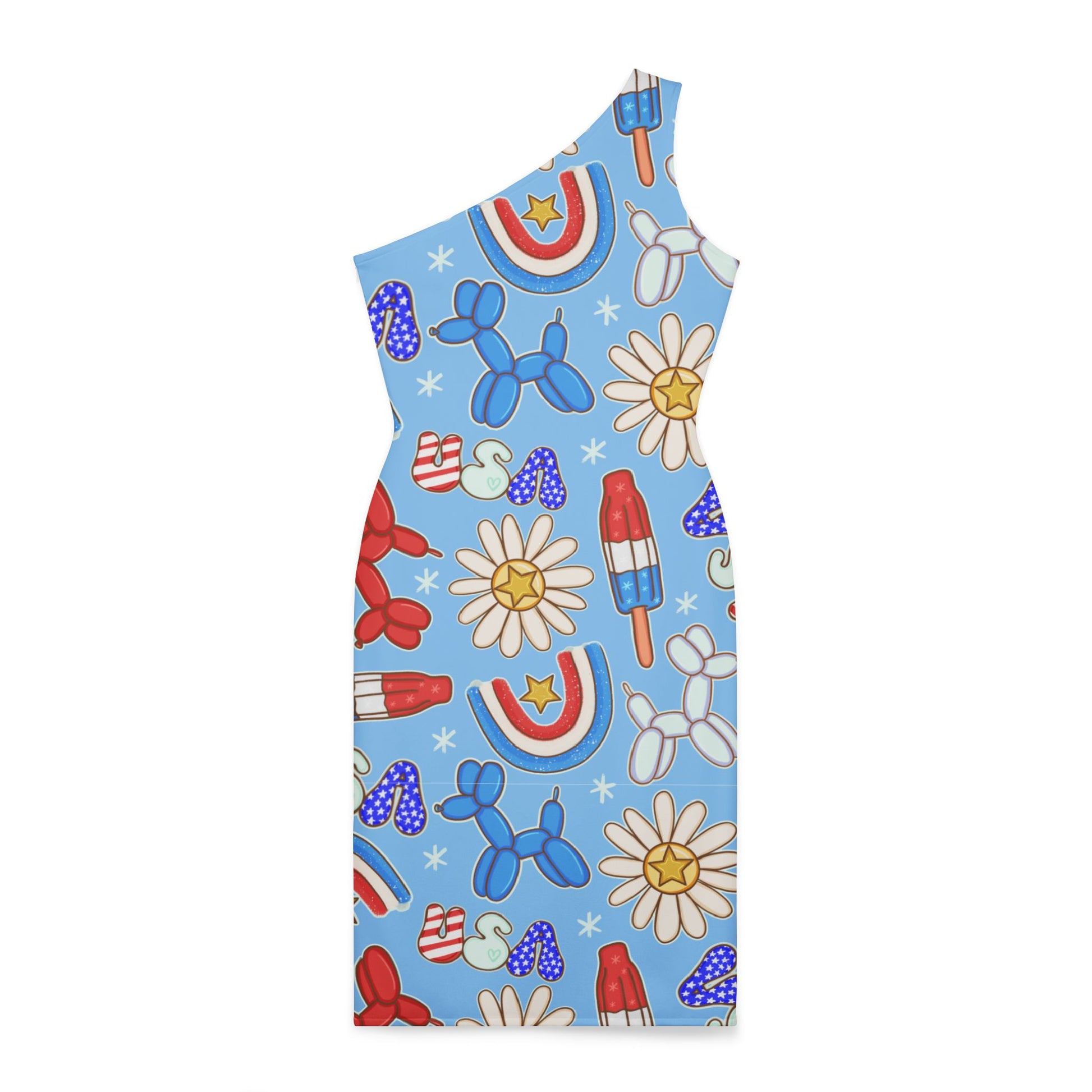 Introducing our USA Design Shoulder Dress - a perfect blend of sophistication and patriotic flair. This one-shoulder dress showcases a fitted silhouette that hugs your curves beautifully, paired with a knee-length straight hem that adds a touch of elegance. Designed with versatility in mind, its sleeveless cut and true-to-size fit make it ideal for any event, whether you're dressing up for a formal occasion or going for a chic, casual look.