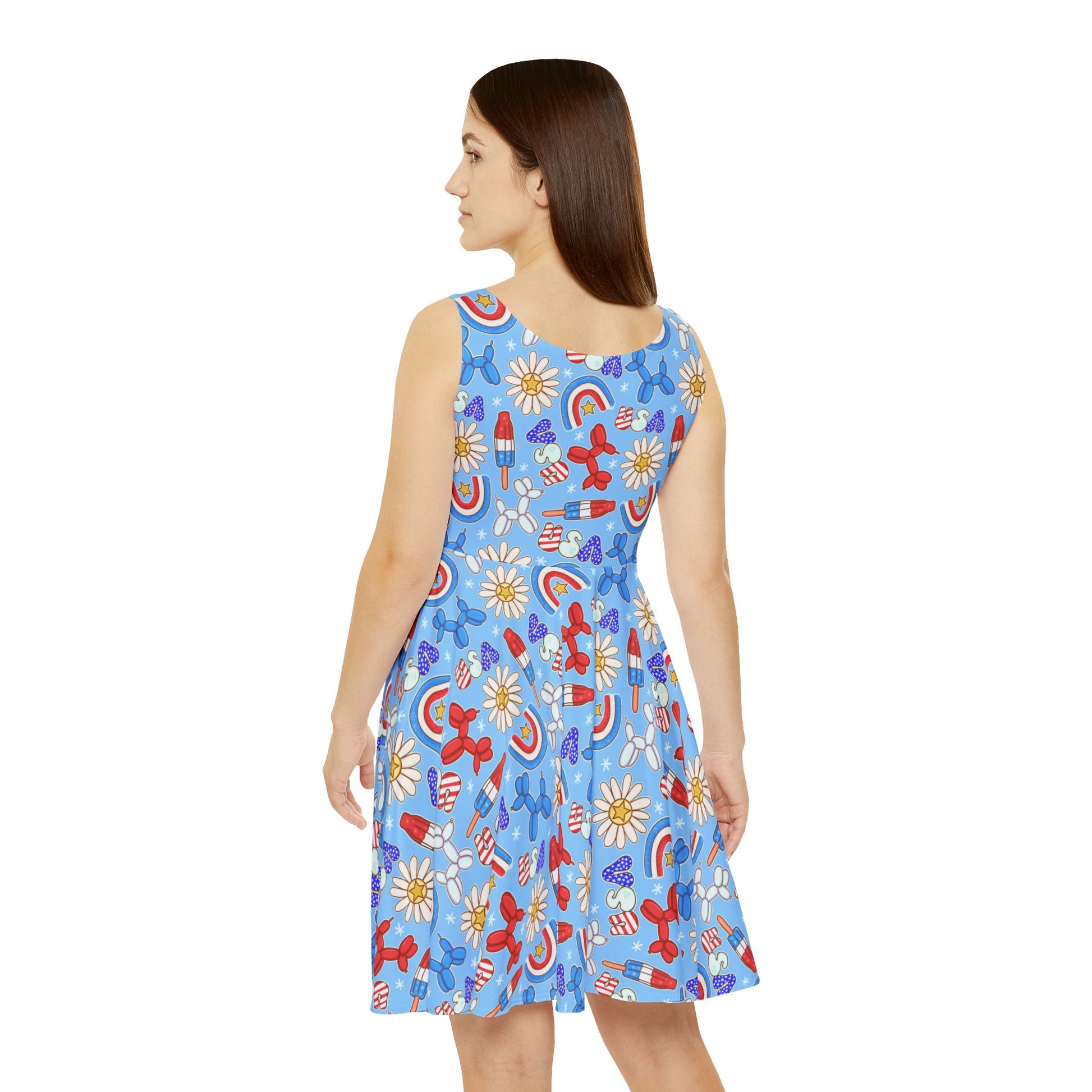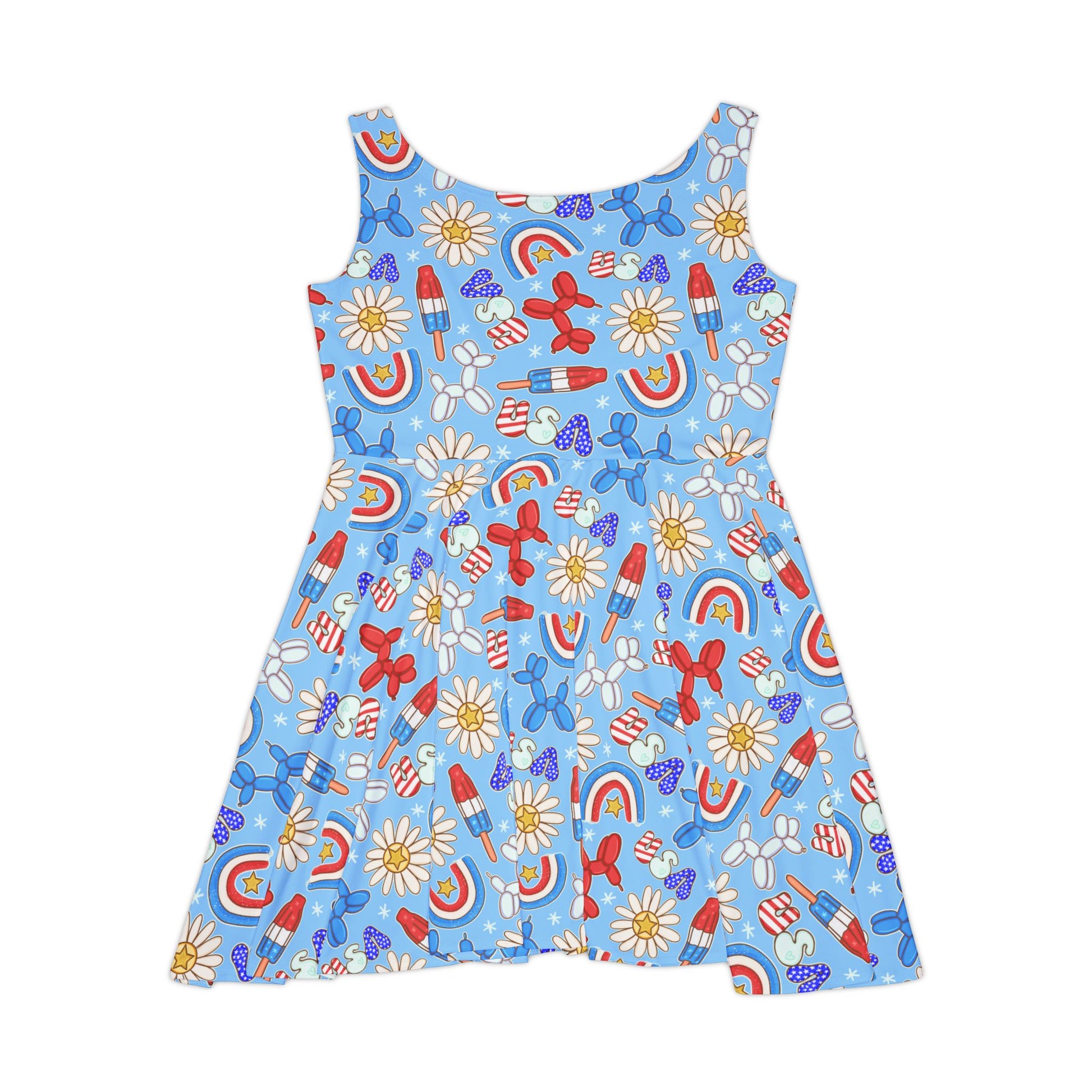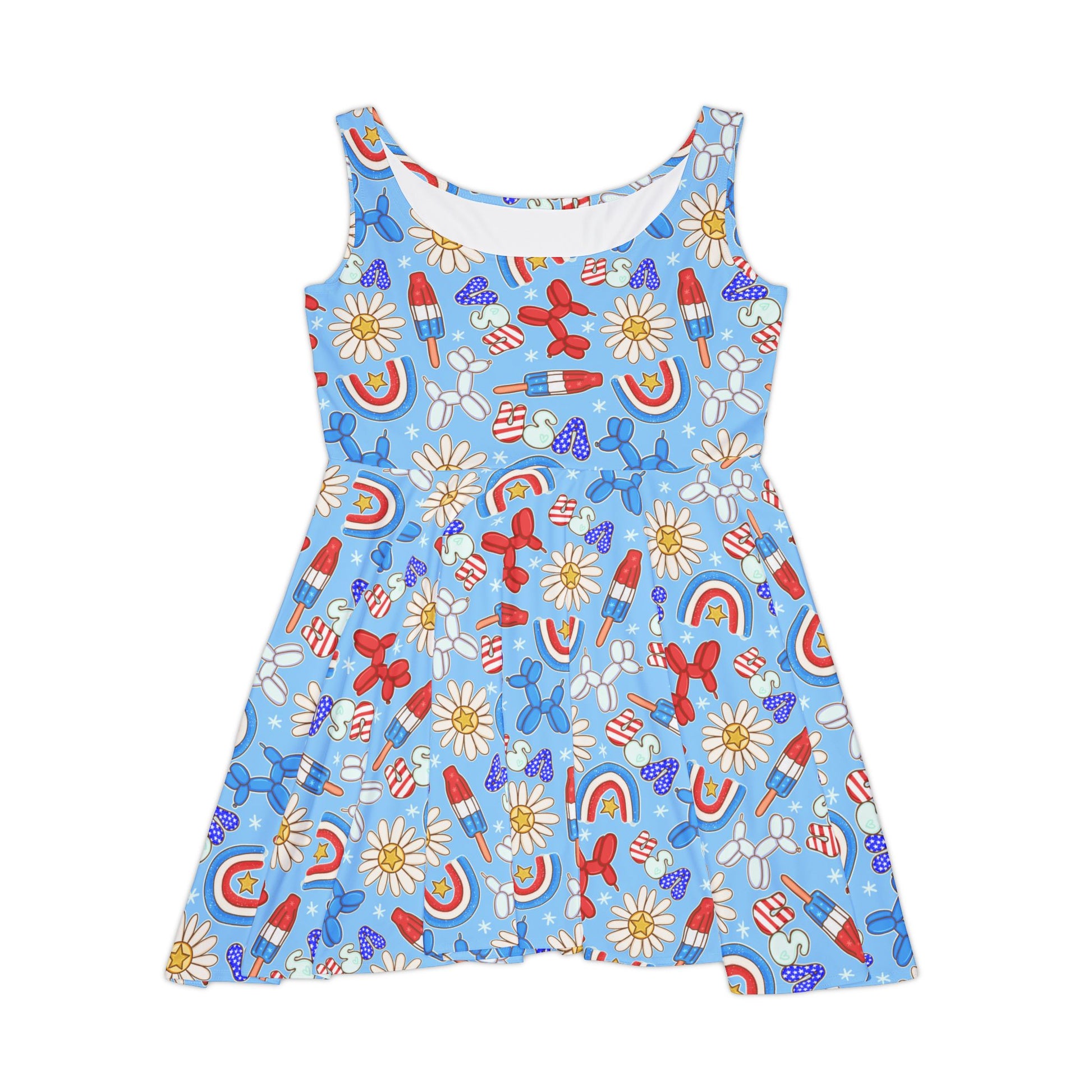 Bring a bold, patriotic vibe to your wardrobe with this USA-inspired skater dress. Whether you're hitting the town or lounging in style, this skater dress combines comfort and flair. Crafted from a high-quality 290gsm fabric blend of 83% polyester and 17% spandex, it's both stretchy and soft, making it perfect for any occasion. Featuring vibrant USA flag motifs in an all-over print, this mid-length dress is a standout piece for celebrations like the 4th of July or Labor Day, or simply for expressing your love for the red, white, and blue all summer long.