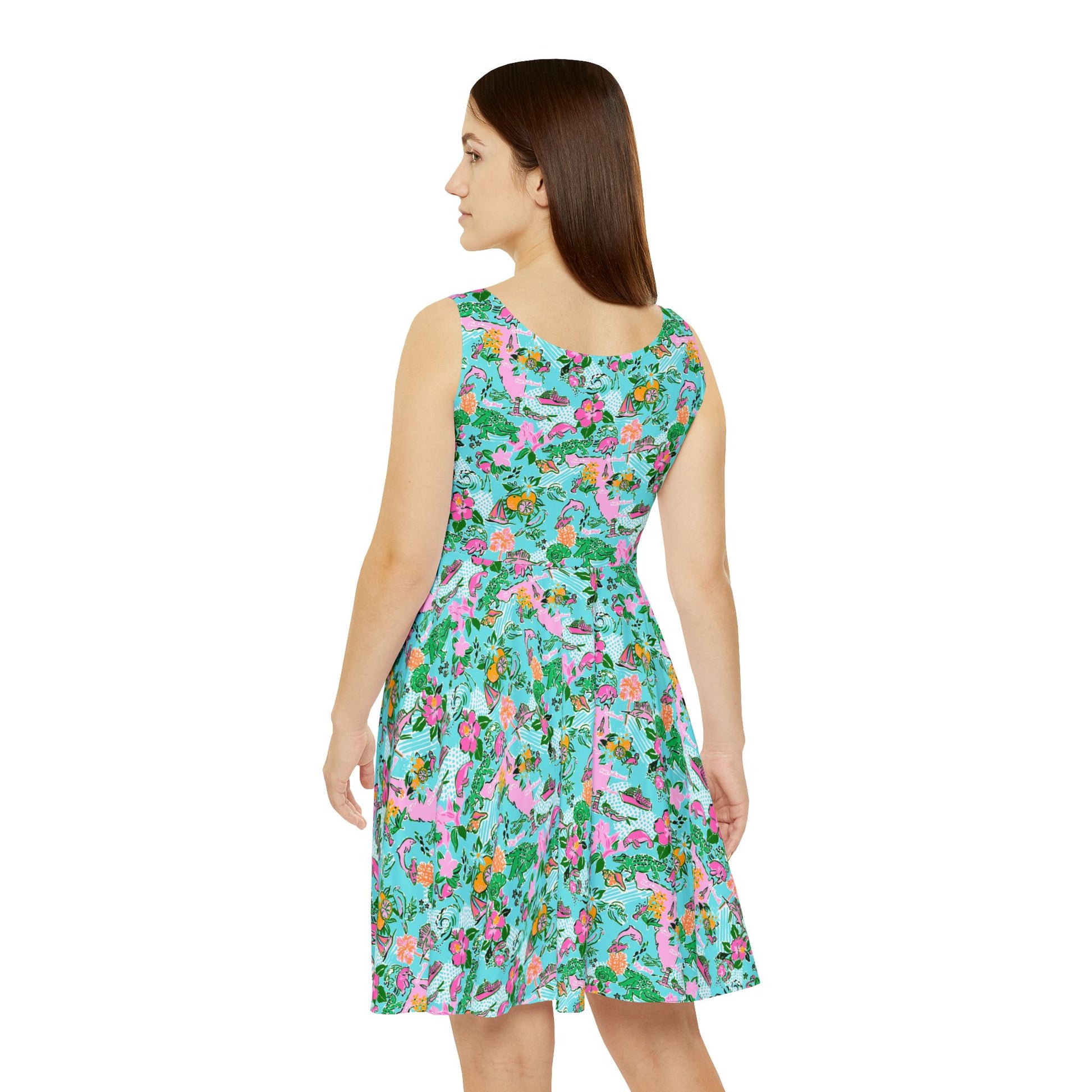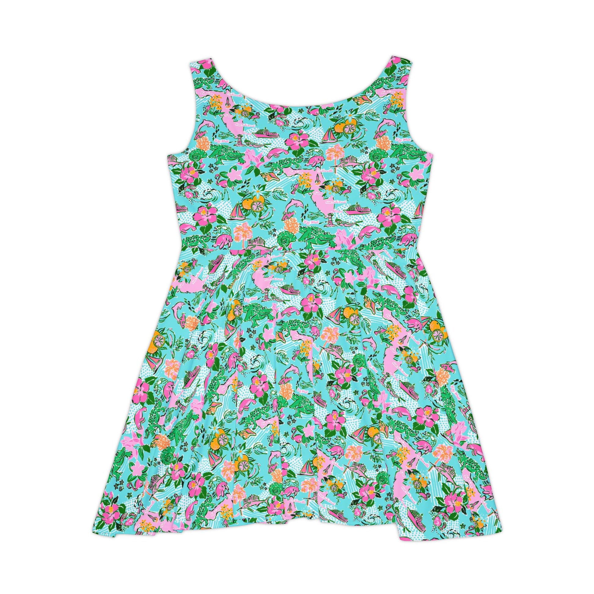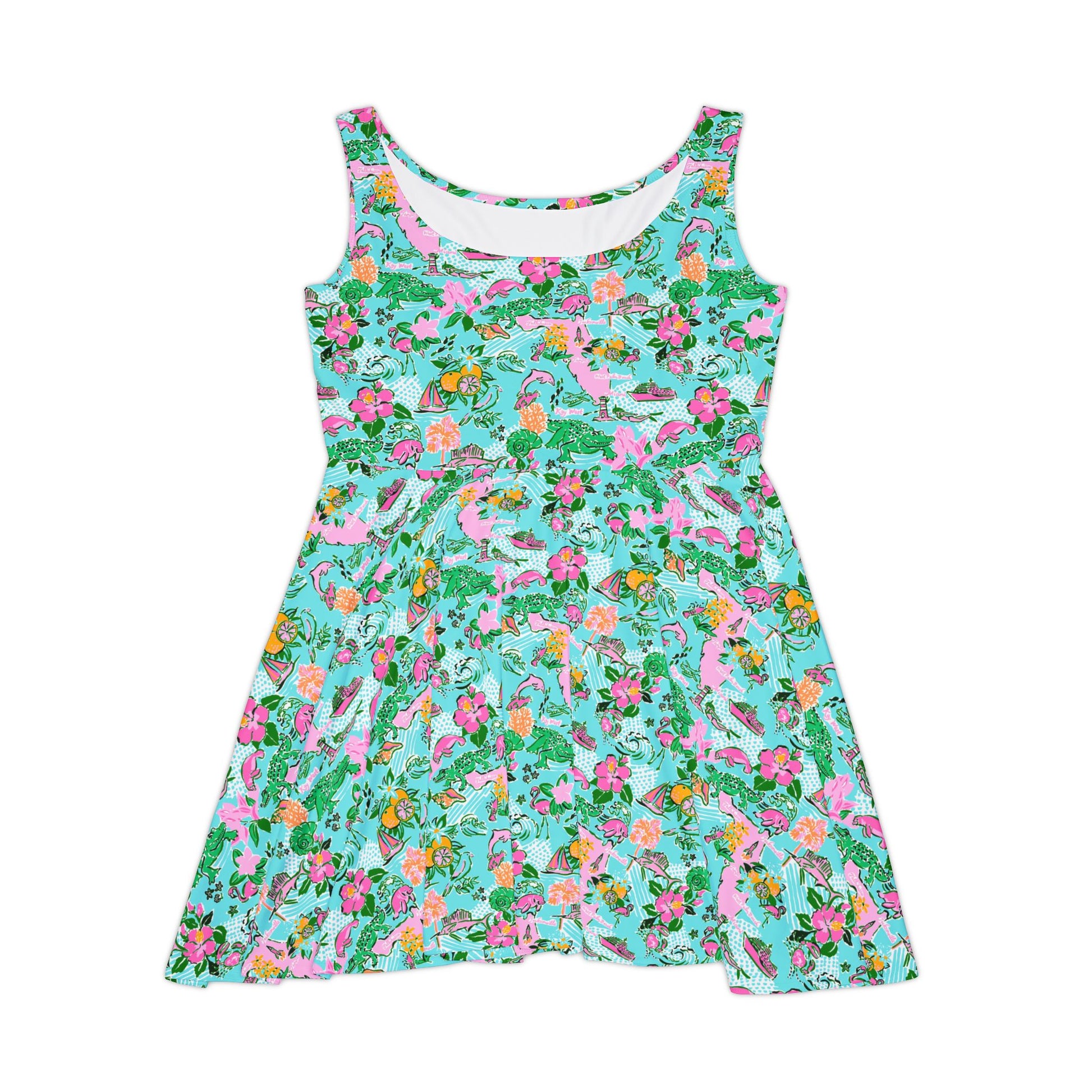 Add a splash of sunshine to your wardrobe with this Florida-inspired skater dress. Whether you're strolling along the beach or exploring the city, this dress blends style and comfort effortlessly. Crafted from a premium 290gsm fabric blend of 83% polyester and 17% spandex, it’s soft, stretchy, and perfect for any occasion. Featuring vibrant Florida motifs-like tropical palm trees, sunset hues, and beach vibes- in an all-over print, this mid-length dress is your go-to for a relaxed yet fashionable look. Ideal for summer outings or bringing that tropical Florida feel wherever you go.