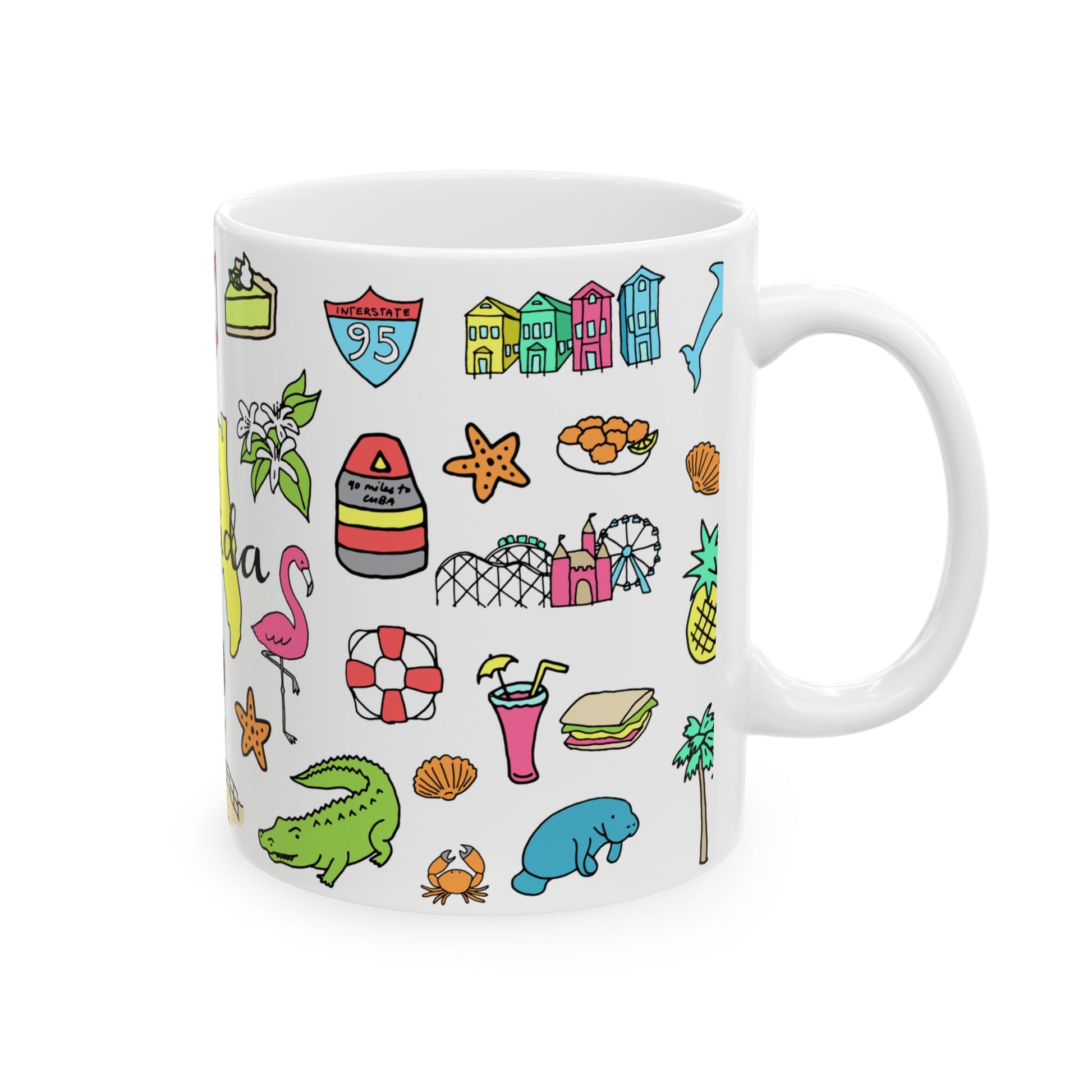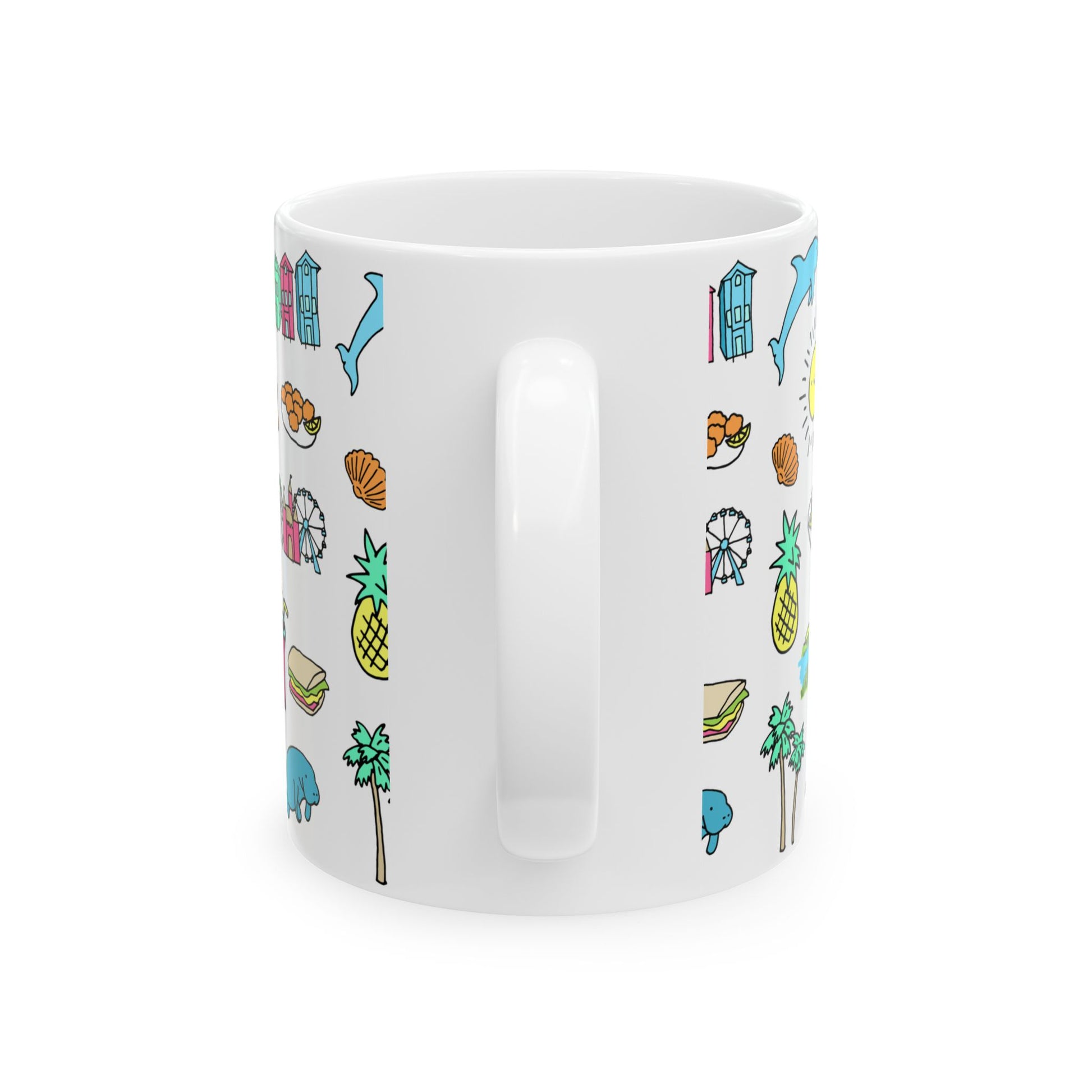 Crafted from durable white ceramic, this 11oz mug is the perfect size for your favorite beverages. The comfortable C-handle and shiny finish make it both practical and stylish. With its vivid, high-quality Florida-themed print, it's perfect for anyone who wants to showcase their love for the state’s beautiful beaches, warm weather, and lively culture. Plus, it's BPA and Lead-free, microwave and dishwasher-safe, so you can sip in style without any worries.