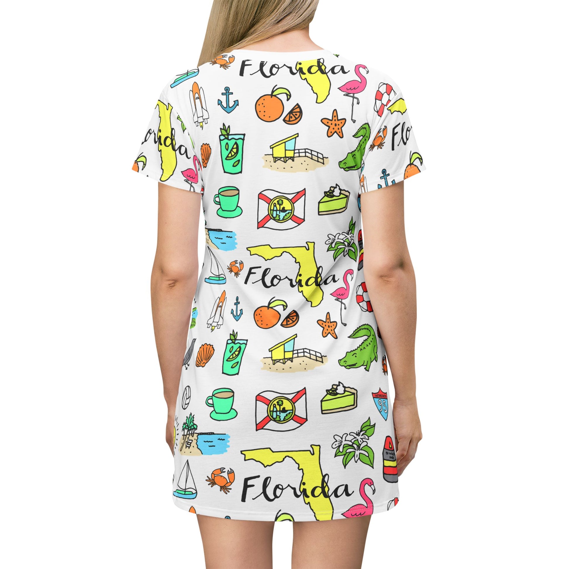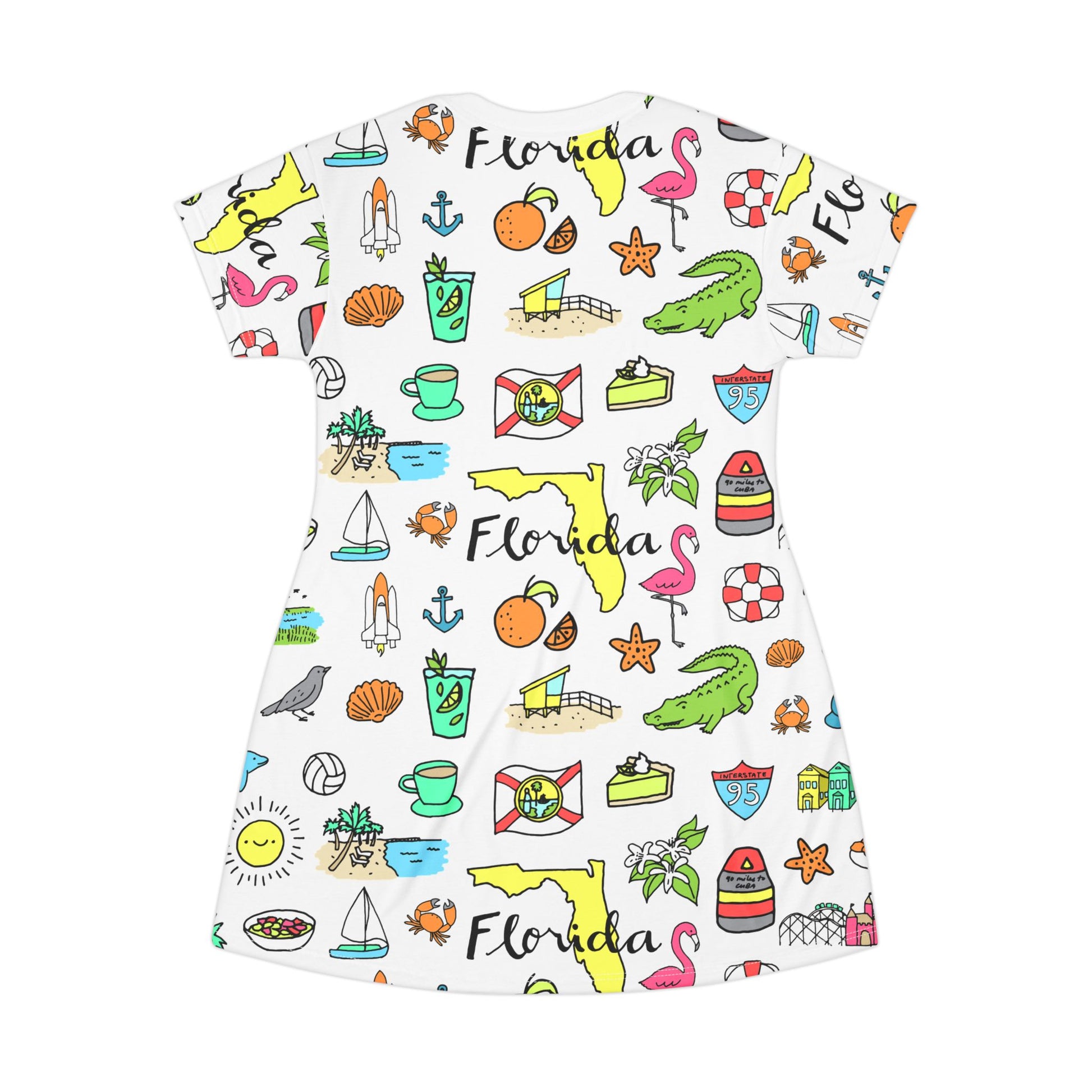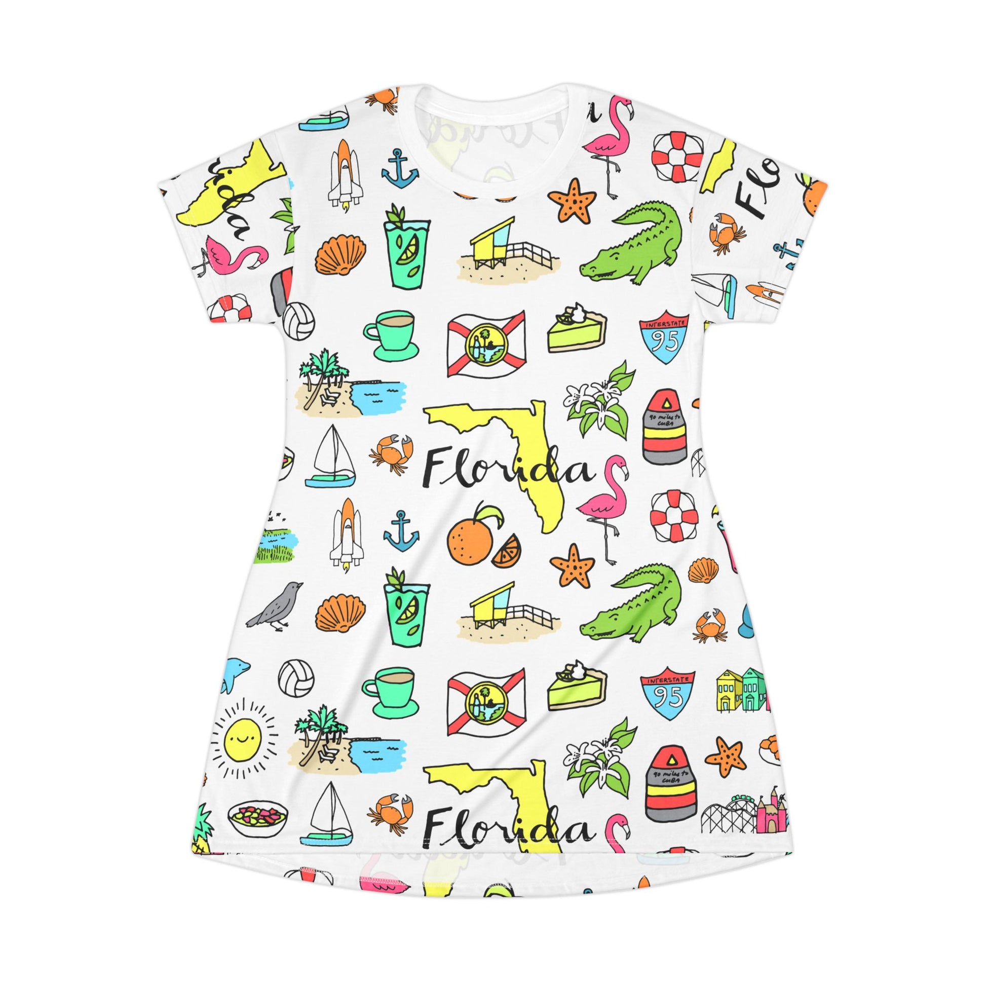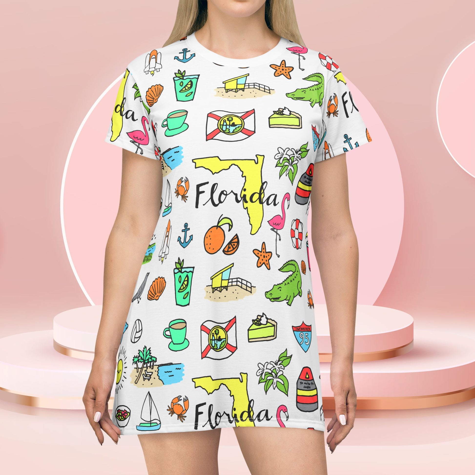 Get ready to bring the sunshine wherever you go with our All-Over-Print T-Shirt Dress featuring fun Florida-inspired designs! This isn’t just any dress- it’s a burst of tropical vibes and laid-back style, perfect for making a statement whether you're hitting the beach or just soaking up the good vibes around town.